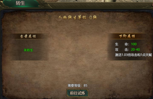 对这款游戏稍作了解。当玩家达到 85 级时,转生系统便会开启。开启转生系统后,玩家可消耗元宝进行转生,亦可购买相应赞助以获取转生证明,从而实现转生。由此可见,这款游戏的转生速度极快,不管是氪金玩家还是平民玩家,都能轻松便捷地进行游戏。