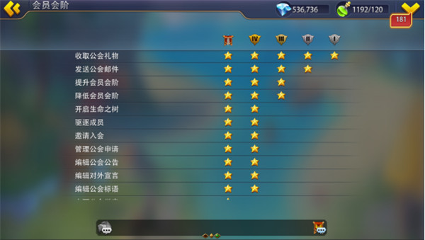 公会成员等级分为:会长、副会长、精英、高级成员、初级成员5个等级。会长与副会长可作为公会管理者可以更改公会内外公告、处理公会申请、驱逐成员。会长可以更改公会名称、代号、徽章、解散公会、变更所属王国。