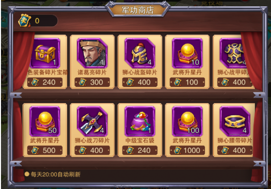 这里建议玩家优先换武将升星丹,这个东西前期贼缺,荣誉商店中还可以兑换诸葛亮哦(非常NB的后排群控输出武将)