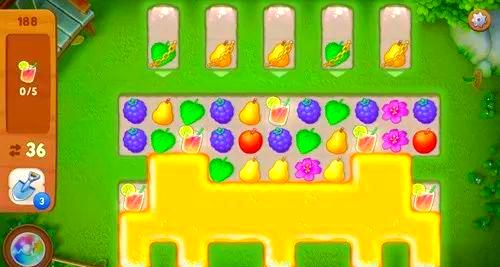 188关,经过反复尝试,我终于凭借好运通过了。在多次尝试中,我深刻体会到这关的难点在于必须使用彩虹炸弹。通常,上部分的链条会锁住两种水果,而单个消除炸弹或彩虹炸弹似乎并不足够。最后,我发现至少需要使用两到三个彩虹炸弹才能成功完成本关。