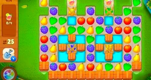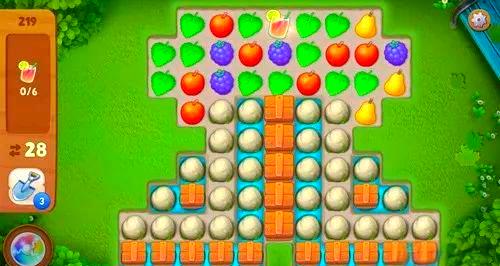 219关中,当绿叶组合成炸弹后,建议向左移动并触发爆炸。经过多次尝试,我发现这个关卡中,后掉的水果在左移一个位置后,比右移一个位置更容易与组道具结合。炸弹的主要作用是炸掉中间竖排的木板以及竖板左右各一排,这样就能为后续的消除创造条件。也要注意左右第二排的上部分,但其他位置不必过于纠结,避免浪费步数。