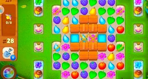 在329关中,难点在于如何炸开蜂蜜罐。需要注意,仅有炸药管和炸药桶能够破坏蜂蜜罐,而这两种道具在本关中相对稀缺。还隐藏了一些小技巧:在中央的木箱内,第二排木板的1和4位置各藏有一个炸弹。首先需要挖出这些炸弹,然后巧妙利用它们来炸开蜂蜜罐。