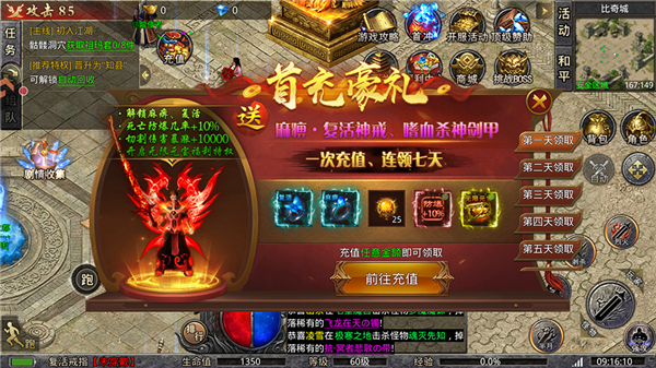 前期流程也是做主线任务激活VIP等级,有能力的建议优先把10+30+50+100四个档位拿满,这四个档位首次都是双倍钻石,累计充值满300直接开通宰相,解锁自动回收+一键拾取+打金功能(打到的东西皆为不绑定可以卖给大佬)+魔法书技能,增加大量属性,然后还能领取首充98送的幻武+时装+复活+麻痹戒指,伤害和防御拉满,进图各种虐怪;