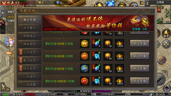 中小R的前期同样适合大R玩家,建议每日充值1000把累充奖励拉满,给高级宝石和大量提升的材料,赞助开到皇帝,提升大量爆率和属性,额外增加15%的PK伤害,再送一本4级十步一杀,攻击敌人可以冰冻,杀人越货必备,开服活动的神装限购也可以进行购买,增加大量的百分比属性,且提升装备被爆的概率,可以创建一个自己的行会,开服第五天晚上可以拿沙,城主可以专属幻武和时装,彰显实力;