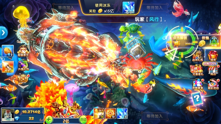 3、融入独创的闯关、BOSS挑战与事件玩法,结合场景互动与技能组合,打破传统捕鱼单调体验,让策略与趣味并存;