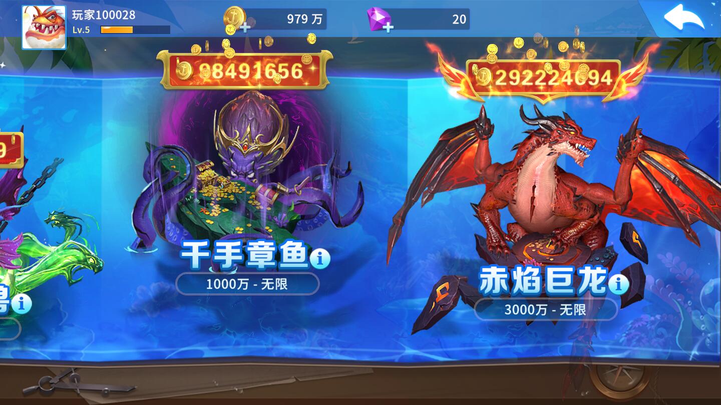经典渔场有史前巨鳄、熔岩龙龟、深海巨兽、千手章鱼、赤炎巨龙。