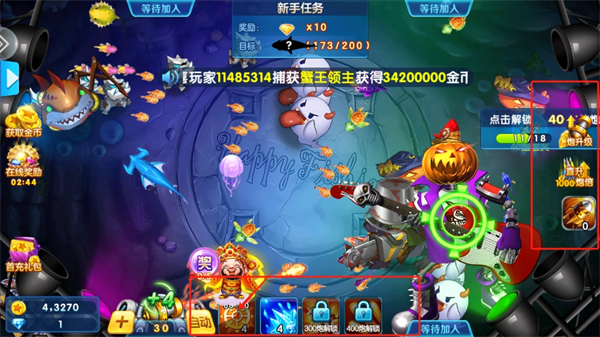 2、游戏内可以开启自动模式,也可以升级炮台提升实力。