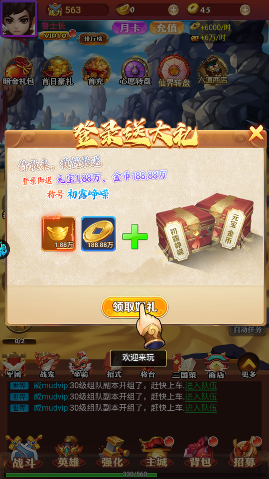 1、进入游戏,就会赠送1.88w元宝,金币188.88w,点击领取好礼即可;