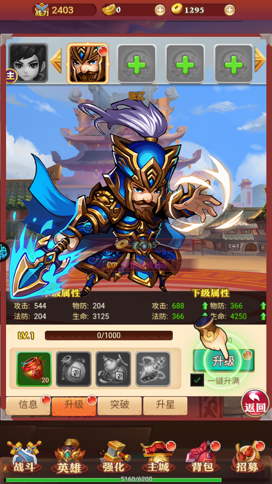 4、还支持对角色进行升级,从而提高攻击、物防、生命等等。