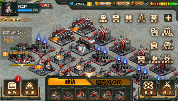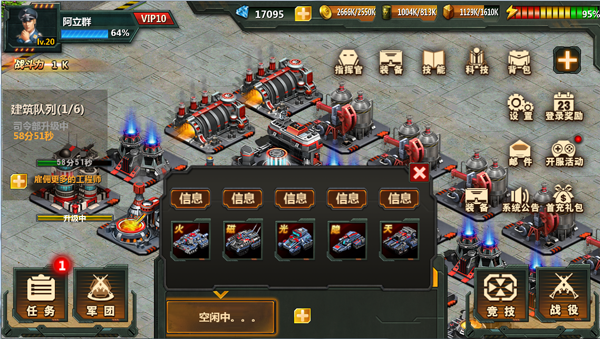 右上角:钻石、金币、石油、铜矿、登录奖励、开服活动、首冲礼包等;