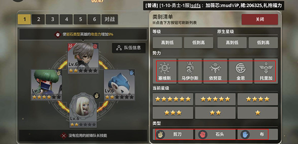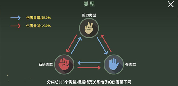 2、剪刀、石头、布三种类型之间存在克制关系,玩家可以根据敌人类型上阵对应英雄,从而更好的击败敌人。