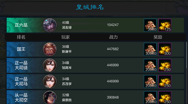 主城中选择皇城可参与皇城争霸玩法,本国各位主公靠实力来决定各位的官阶,从国王、正一品到九品不等,其中每个国家国王只有一名,其余 各官阶数量不等。