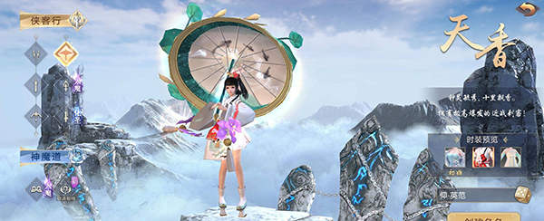 2、剑姬天香:九幽落花剑芒闪,芙蓉侠骨幽冥香。特点:使用雨伞进行刺杀攻击,落花无声,身法灵动飘逸