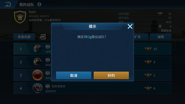 只有指挥官和副指挥官拥有踢出战队的权利,且副指挥官无法对相同职位及指挥官进行踢出战队的操作。