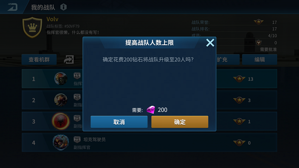 当战队人数达到上限,无法继续增加新成员时该怎么办呢?我们可以选择扩充战队来增加成员空位。只有指挥官和副指挥官可以进行战队扩充。将战队容量由10人扩充到20人需要消耗200钻石。