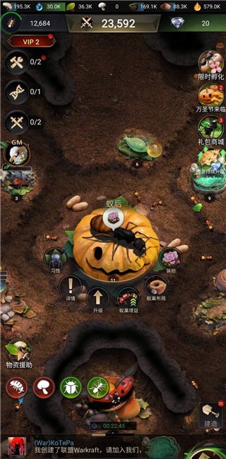 蚁群的数量代表了一个蚂蚁家族的兴衰,为了蚁国的发展和荣耀, 你必须要尽可能多的提升蚁群的数量,带领它们抵御外敌, 争夺资源, 扩张势力!