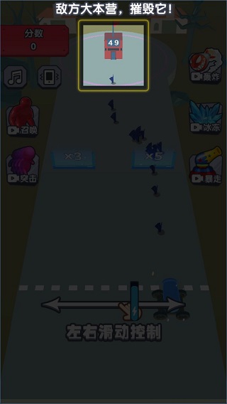 对面便是敌方大本营,通过左右滑动控制,增加士兵数量,依靠数量的优势催他敌方大本营。