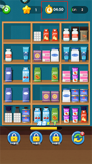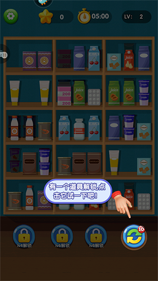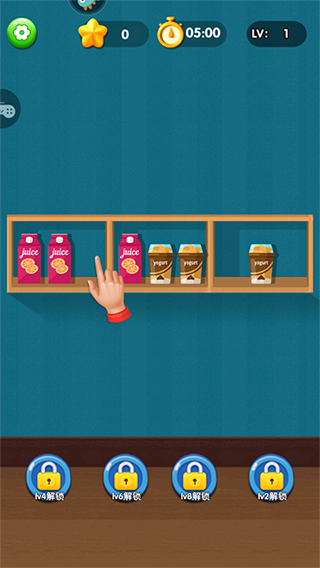 只需将相同的物品移动到货架上,消除容器上的正方形,玩家只需将相同的项目放在一起即可解决。游戏提供许多道具和特殊的方块,你就可以获得很多奖励来完成关卡任务