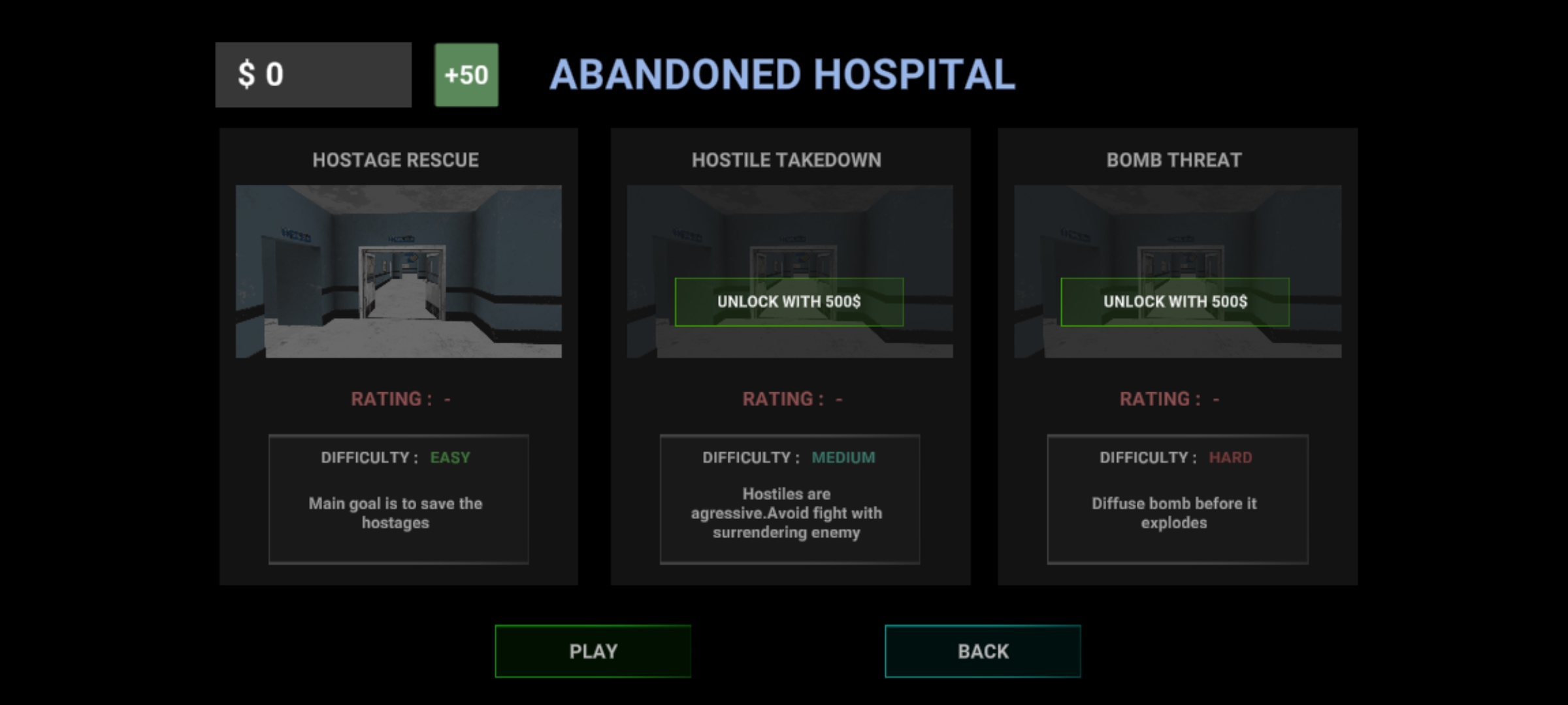 4、选好武器后,推门出去,选择HOSTAGE RESCUE废弃医院,主要目标是拯救人质,点击【play】