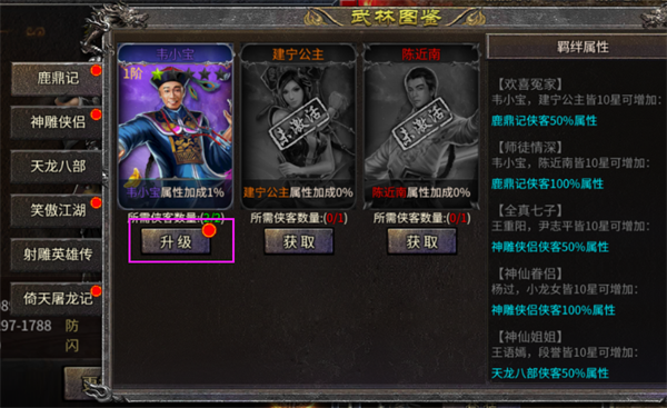 当我们获得重复的侠客时,可以在图鉴页面找到该侠客,点击图鉴下面的升级,即可提高图鉴的星级