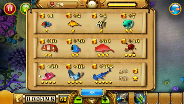 4、下图为不同鱼类的金币价值,现在开始尽情捕鱼吧。