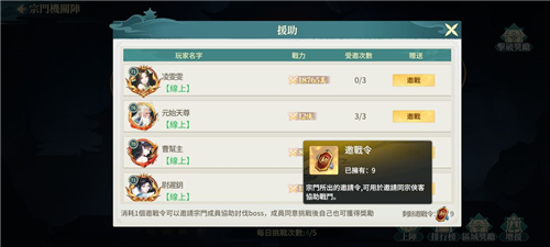 宗门悬赏,也是获取升级宗门功法道具的主要来源,可以和宗门里商量好,约定个时间一起打,奖励也不少,宗门BOSS打完会开箱子,邀战令是好东西啊,可以指定一位玩家增加一次挑战机会,且双方都能获得300金券,两个人商量一下,一人一次,就是600。