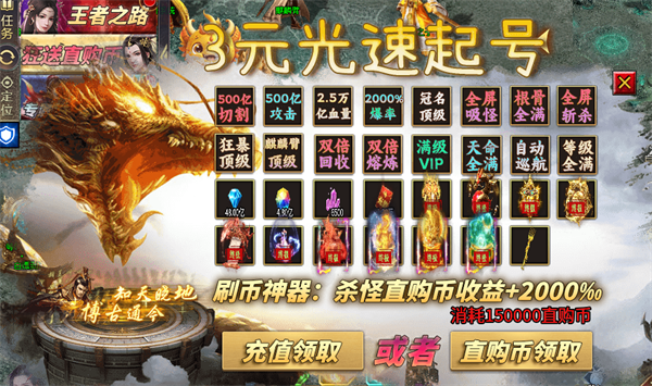上线直升9999级免费领取自动回收 自动拾取 附带新手指南 助力快速上路,领完助力其他什么都不用管,跟随王者之路一路直冲 干就完事