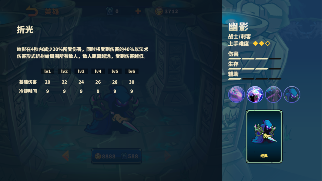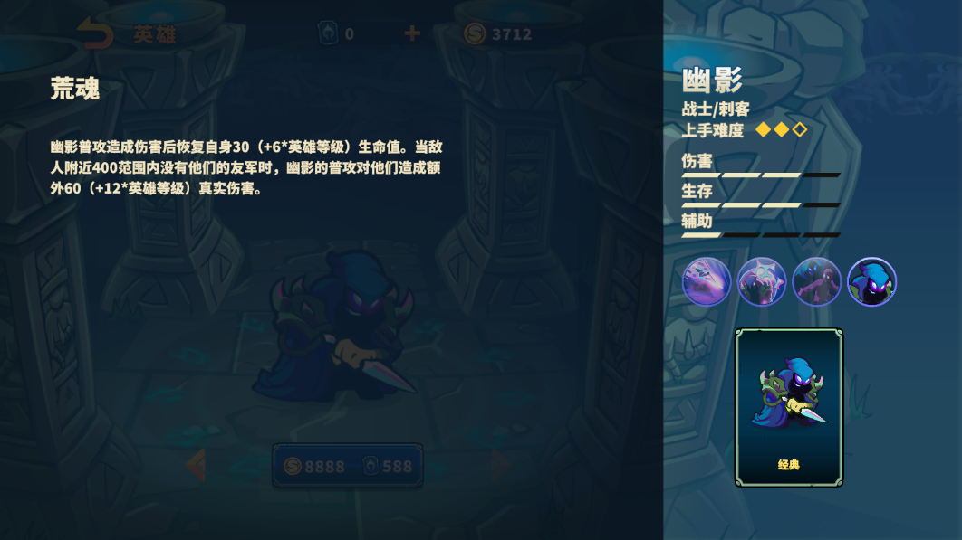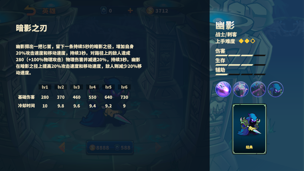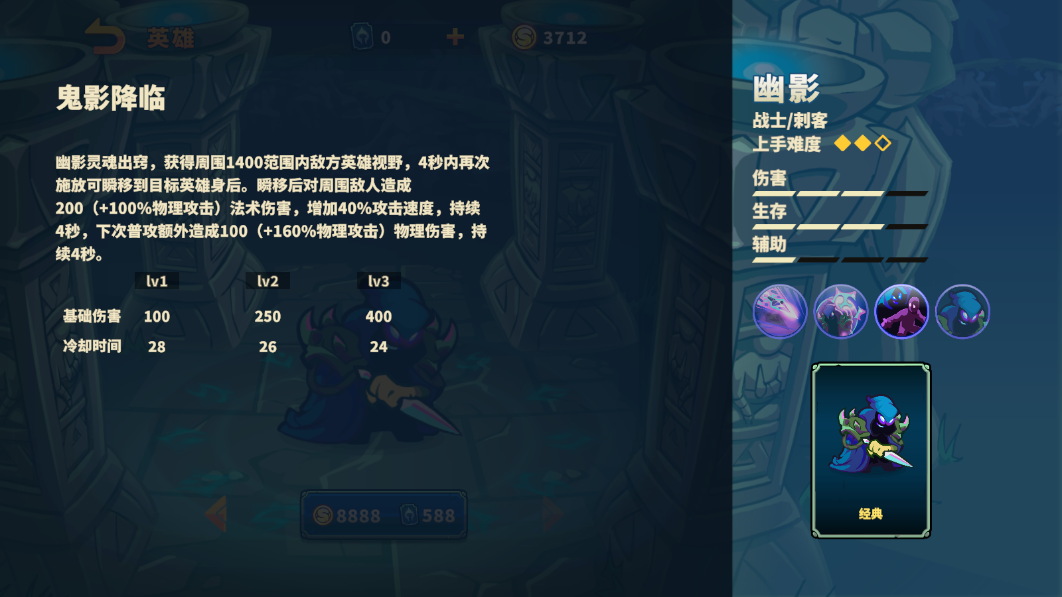 幽影是一位刺客类型英雄,其拥有较高的伤害和生存能力,机动性强