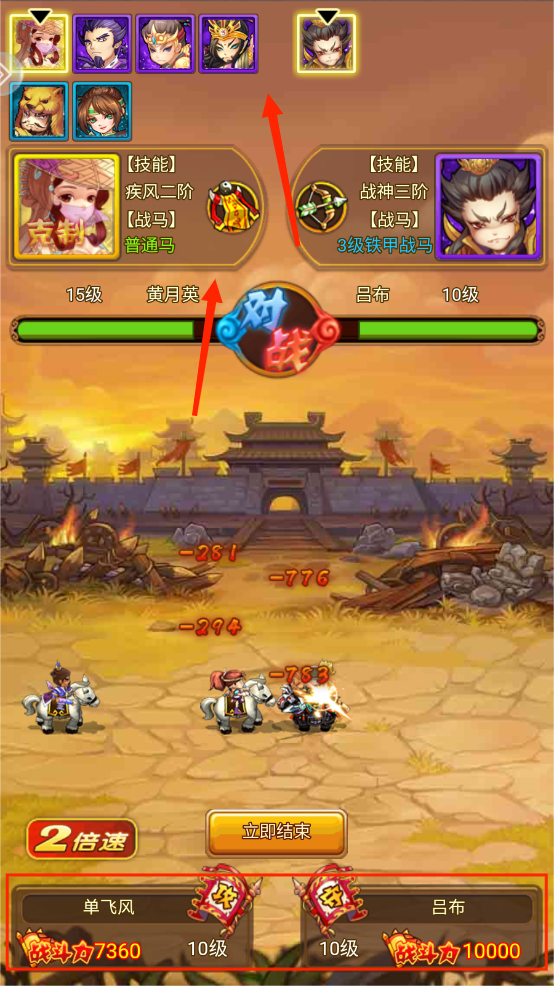 上方是我方武将和敌方武将,中间是当前对战武将详细信息,下面是双方队伍总战力对比