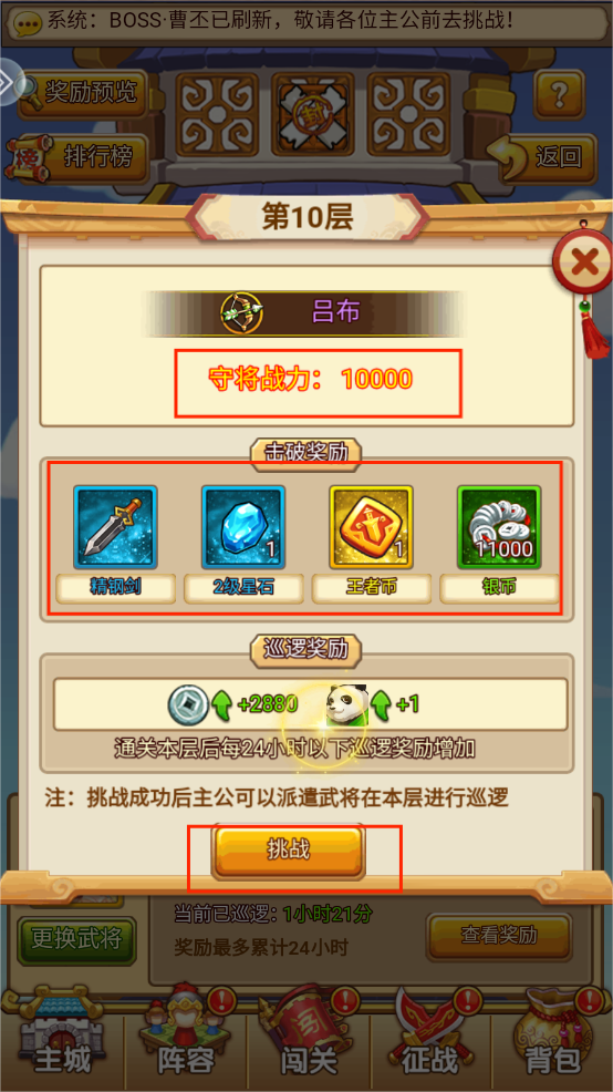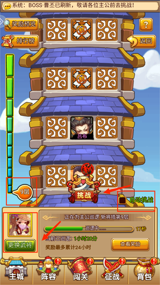 主城进入斩将塔,选择自己的武将,点击挑战进入战斗,获胜即可进入下一层,如果不想一直点,可以勾选自动挑战,游戏就会自动帮你点击进入挑战,通过楼层之后会有巡逻奖励,自动巡逻累计奖励自动累计最多24小时。