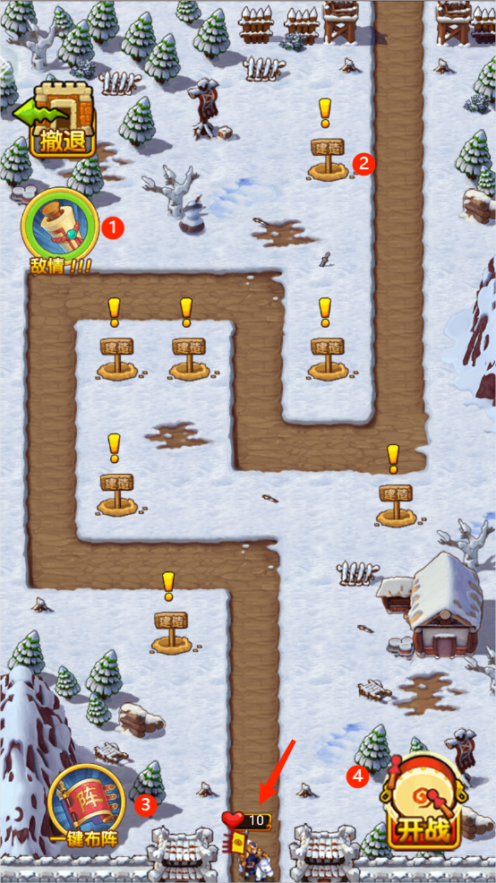 1、敌人进攻进度,2、武将布置处,点击可以挑选你队伍里其中一个武将进行布置,3、或者不想一个一个布置可以点击一键布置,4、布置完成后就可以点击开始让敌军进攻了。箭头处是你这场要守护的要塞,只有十点血量,被扣完了就会失败。