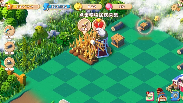 8、累计合成可以建设出来相应的加工建筑,点击采集提示按钮可以引导居民前往田地或物品收获特殊物品。