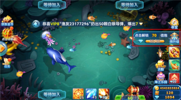 捕鱼不能一味攻打,关键时刻还要恰当使用技能键。像白鲨或者金鲨,捕捉成功获得的奖励都比较大,即便你的炮倍数高,但是不运用一些辅助技能键,未必成功捕到大鱼。使用瞄准技能,配合高炮,就能助你提高命中率。使用冰冻键,能封动全场,这时你移动炮台,找准目标,就比较容易击中。