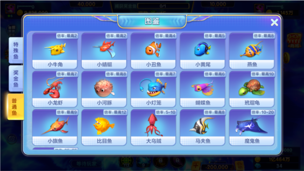 ④河豚鱼:吃5号炮,鼓起来的时候一般不打,这时命中率会变低一些。所以在河豚鱼和乌龟或灯笼一起出来的场景,一定要用5号炮,因为可以粘中河豚鱼。