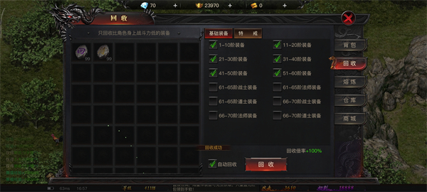 开启自动回收功能,清理背包里战力低的装备,回收获取资源,让背包更整洁,资源更合理利用。