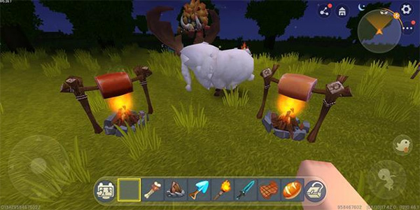 因为野人是在晚上的时候才会出现,所以我们先要等到晚上,然后将篝火放在地上,用火炬将篝火点燃,点燃篝火后在上面放上生肉进行烧烤。