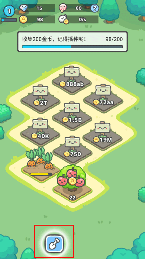 3、点击屏幕下方的铲子,就能切换到种植模式,长按按钮即可疯狂种!