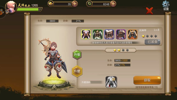 绿色升级按钮,黄山升星按钮,我们可以通过升星和升级,来提升我们武器和时装的属性加成。升级需要消耗铜钱,而升星则需要消耗我们的武器或者时装碎片。