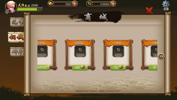 我们去游戏商城购买铜钱!为什么要买铜钱不买碎片技能书呢?因为,最便宜的技能书要10元宝,而我们50元宝可以兑换一万的铜钱!什么概念呢?就是50元宝拿去兑换技能书升级技能,最多升到3-4级。而如果我们拿去兑换钱币,去升级武器和时装,那么打底可以升到5级左右,而且还是同时升级了武器和时装!能更高效的使用元宝。