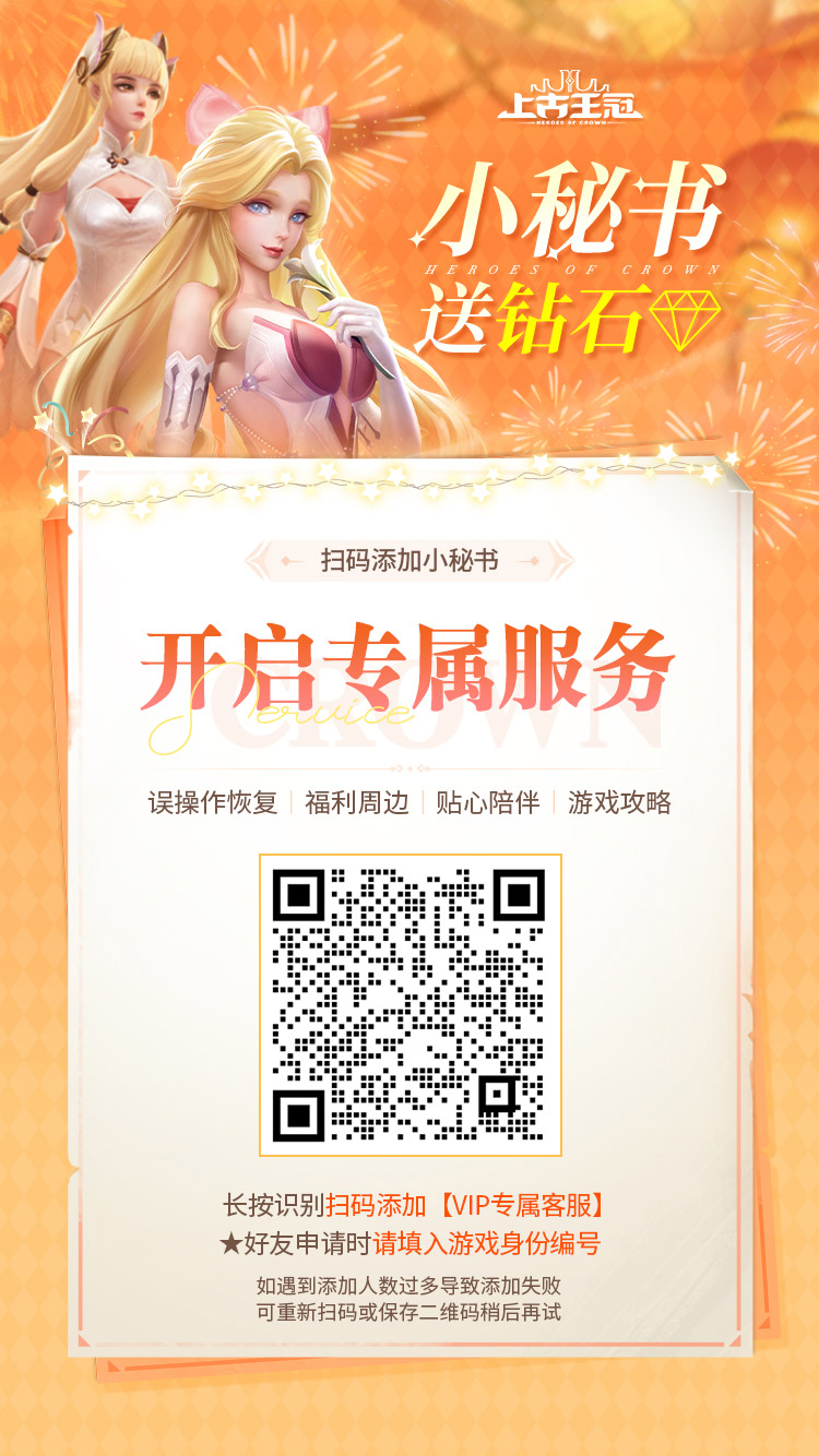 点击这里直接跳转微信或截图至微信扫码添加,或关注“上古王冠”微信公众号,在公众号内对话框输入“秘书”,根据提示添加。