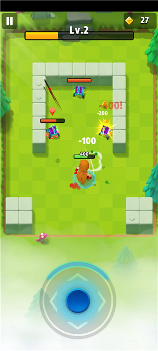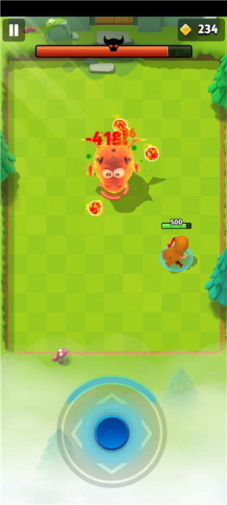游戏采用单指滑动实现移动与射击的同步操作,极大降低上手门槛。同时融合英雄成长、宠物辅助、武器切换及随机地形机制,玩家需根据关卡特性动态调整策略,兼具休闲性与策略深度。