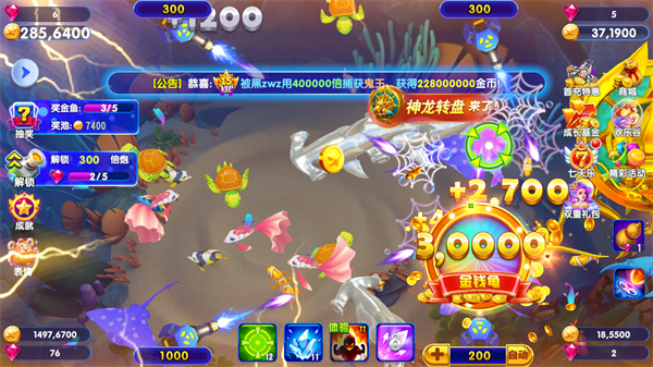 5、在捕捉鱼时,炮台不要盲目射击猎捕,要注意观察得分高的鱼类进行捕杀,不然很容易把子弹浪费掉或用完的。