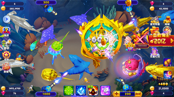 多种炮台玩法任挑,高倍率大炮锁准大鱼绝不落空。狂暴模式一开秒掉整群鱼,子弹反转设计超贴心,万炮齐发时金花四溅。每局都有震撼大BOSS,爆机那一刻金币狂涌,独霸海底的快感直接拉满!