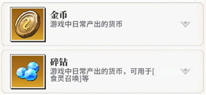 首先要介绍的就是游戏中的硬通货:金币&碎钻啦~二者的使用几乎涉及游戏的方方面面,食灵养成、资源刷取、装备提升等等都需要用到他们,当然碎钻会更为珍贵一些。