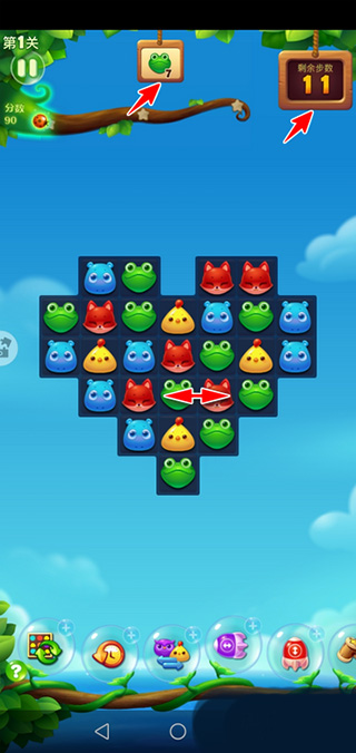 1、等到过关开始以后,页面上方正中将会出现一个任务牌,提示当前要完成的任务(比如这里是要消除10个青蛙);右上角会出现本关可用步数(比如这里是12步)。