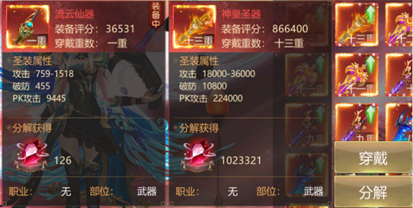 入圣装备分为10个部位,有零至十三重,其中又分为4种品质:蓝,紫,橙,红。装备的穿戴有入圣重数的限制。入圣重数要大于等于装备重数才能穿戴上哦!入圣装备也支持分解、合成、与强化。