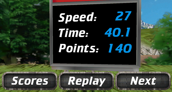 5、顺利通过终点线就可以通过关卡啦,可以查看自己的速度和用时,如果不满意的话可以点击“replay”重新挑战,满意就可以点击“next”进入下一关啦。