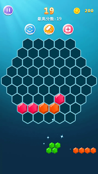 5、六边形消除:玩法较之经典数独游戏更自由,横、左斜、右斜都可消除得分,同样是备选方块无法放置时消除游戏结束。