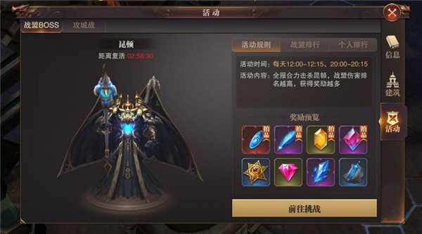 3、当然,除去环类日常任务,玩家还可以每天中午12点和晚上8点打战盟boss,通过对boss的不同伤害获得翅膀合成道具、稀有宝石等道具。合成翅膀的稀有道具若是boos有掉落的话,会在本盟拍卖行集中拍卖,真是自己急需的,建议一口价拍下。