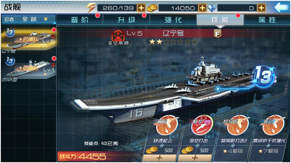 3、界面显示该船需要升级的技能,每个战舰拥有4个技能。